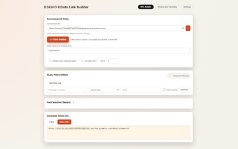D365FO OData Link Builder to rozszerzenie dla przeglądarki Chrome, które umożliwia szybkie tworzenie i organizowanie adresów URL OData dla Microsoft Dynamics 365 Finance & Operations. Użytkownicy mogą korzystać z zaawansowanych ustawień, aby dodawać filtry i wybierać pola, a następnie kopiować lub otwierać wygenerowane linki w nowej karcie. Rozszerzenie pozwala na zapisywanie wielu adresów URL dla różnych środowisk D365FO, co znacząco ułatwia pracę z tymi systemami.